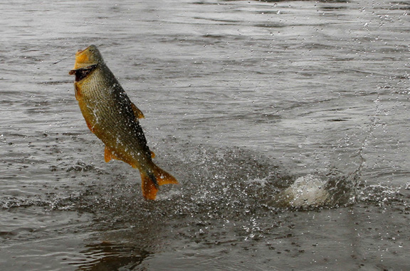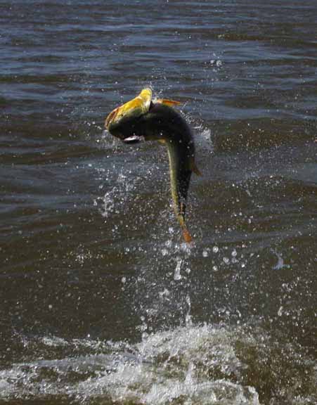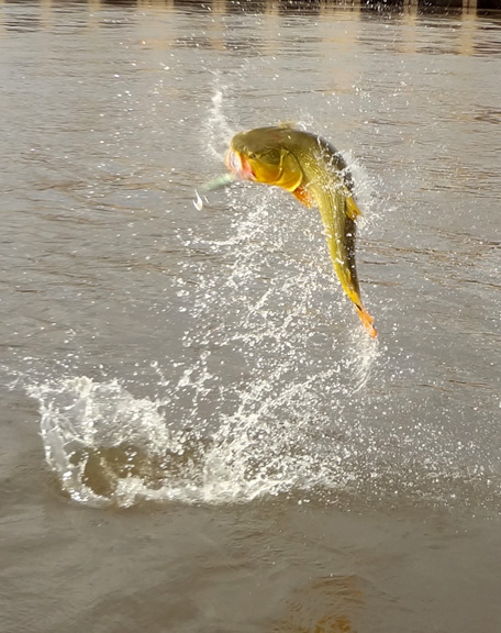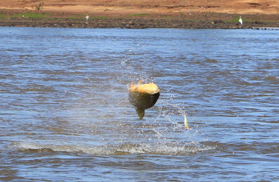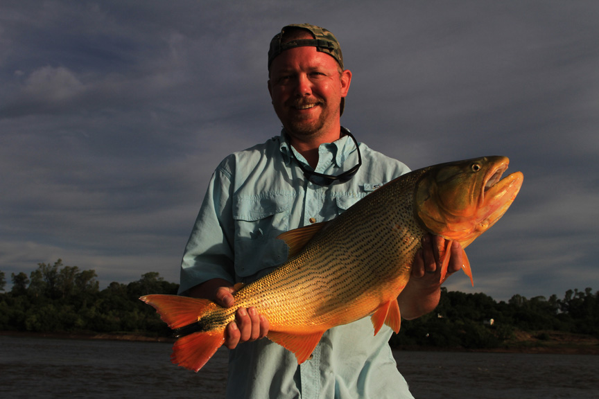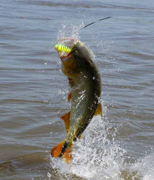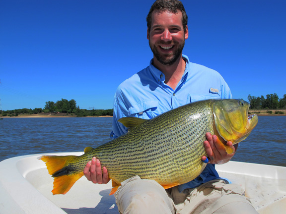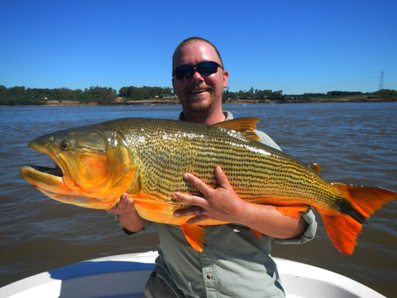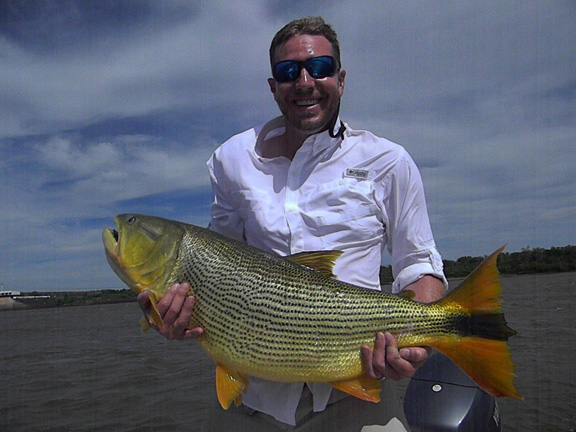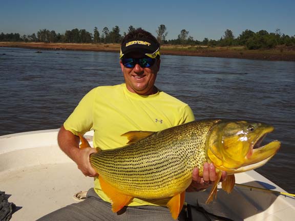 I talked with Skeet looking to travel somewhere different as we traveled to the Amazon the year before, I suggested La Zona in Argentina for monster Golden Dorado he talked with the guys and they agreed to visit La Zona. We would travel with the team of Skeet Reese – winner of the “Classic”, Chris Carpenter -2X World Series winner, Cy young winner and 3X All Star team, Future Hall of Famer Roy “Doc” Halladay- 2x Cy young, 8 time All Star team, Jason Iches, Chris’s brother in law. We arrived in Argentina on a bright and sunny day, the guys had a half day city tour and I met Rodrigo and Carlos OF La Zona for lunch. After a long flight and a long day we had dinner at Cabana Las Lilas at Puerto Madero one of the best restaurants in Buenos Aires and had some excellent beef and malbac the guys enjoyed their meal. We went back to the hotel to get good rest before flying to Concordia in the morning. Our flight was slightly delayed about a half an hour and we landed and Ramiro met us and we proceeded to Tres Sietes lodge, it had rained as the roads were all muddy we spend the afternoon prepping tackle. We had scheduled a capybara hunt but because of the rain we had to change venues to a location in Corrientes province and these were big elusive Capybara, Skeet and Jason both took one. For this special trip Skeet again had some special custom yellow Skeet rods made up for dorado fishing which proved to workout very nice. Before the trip I had emailed to my good friend Hector called in a favor and ask him to guide on this trip for us, our team of guides were Hector, Matias, Alejandro and Elvio during our stay. Our first day fishing was a good one with an overcast sky, very low water and the barometer dropping, fishing was very good today everyone caught golden dorado up to 40lb. Chris caught his first 30lb dorado as Jason caught a 28 lb. When you fish golden dorado you only land about 30 percent as soon as you hook them they are in the air. In testing my new camera I found to have caught many jumping fish with lures flying in the air.
