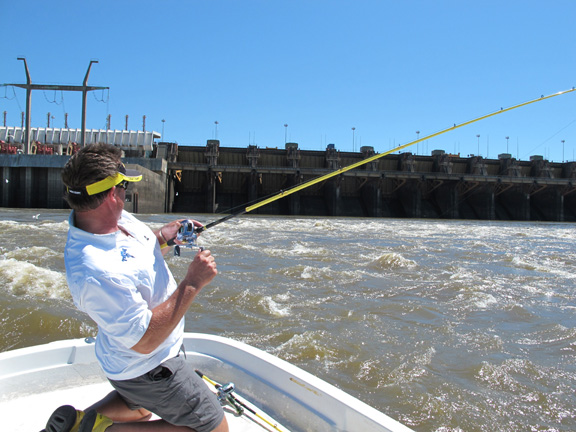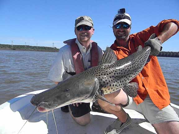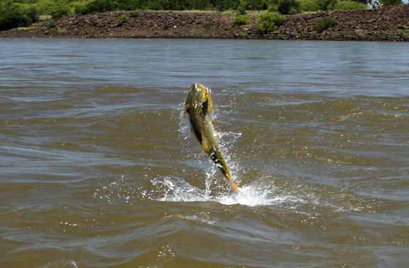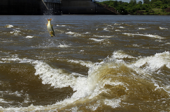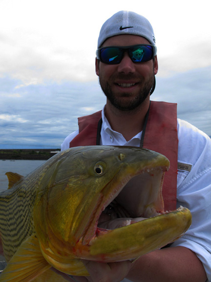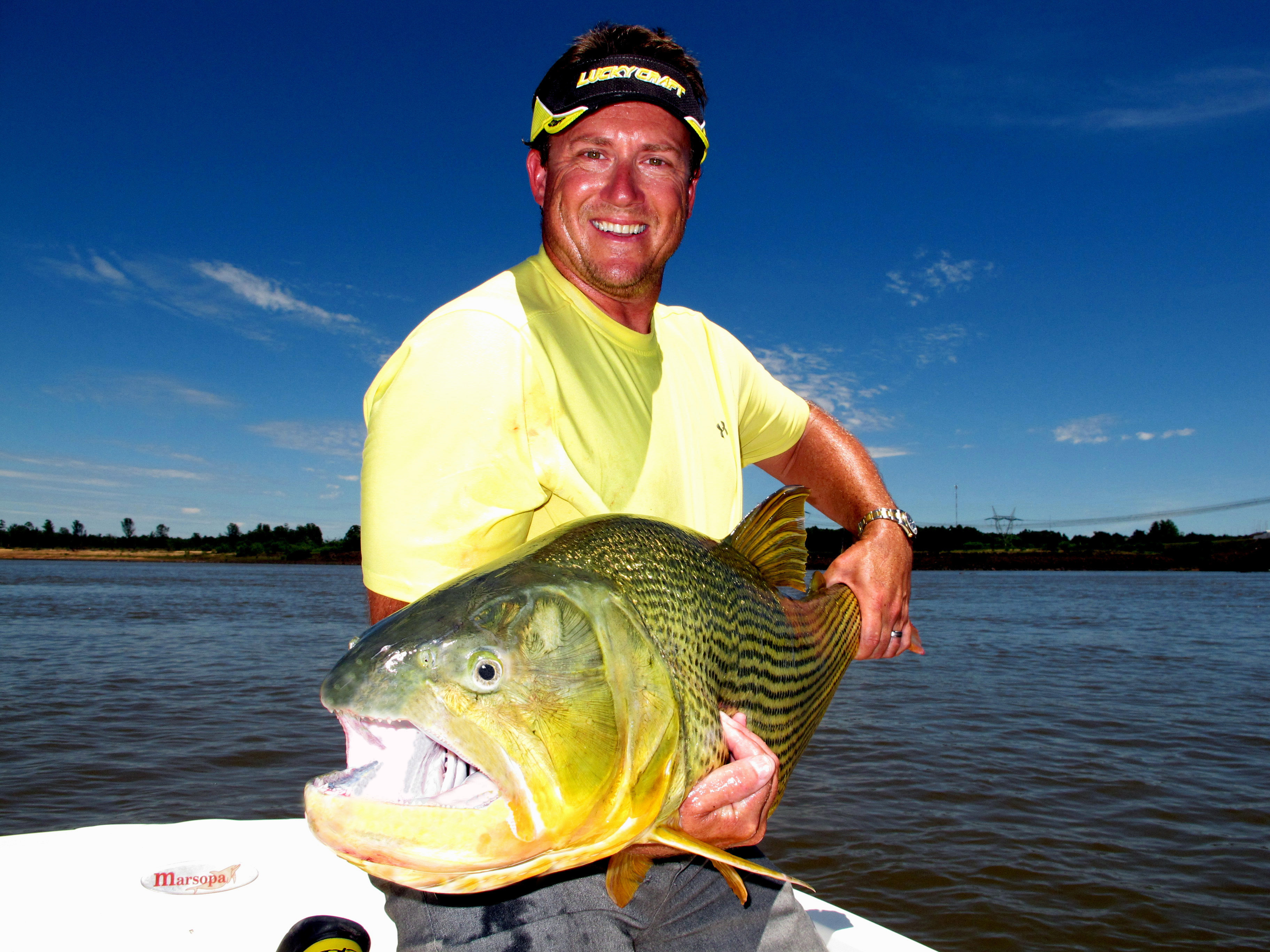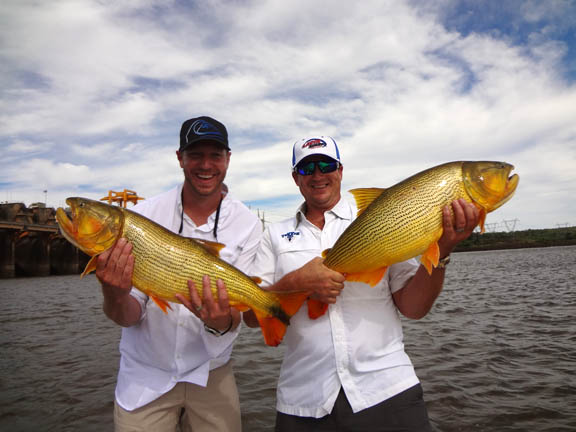 Day four we awoke bright eye and sort of bushy tale after a long night. After breakfast we started at 8am and we all could see that the dam was flowing nicely, birds working in 3 or 4 groups around the dam. The morning session I was with Skeet and Doc we went to the center section of the river and it was conditions similar to class 3 rapids Skeet and Doc were fishing Lucky Craft prototype crankbaits with Skeet on his knees and Doc sitting on the ice chest, Skeet and Doc screaming and hooking fish, losing some, landing some. On the other boat Chris and Jason had an epic morning as they worked the rocks on the Argentinean side and caught a 52 lb dorado proved to be the biggest of the trip and lost an even bigger one they couldn’t stop before it ran around a rock, Chris also caught a 40+ today plus many in the 20lb class. Jason did well and held his own.